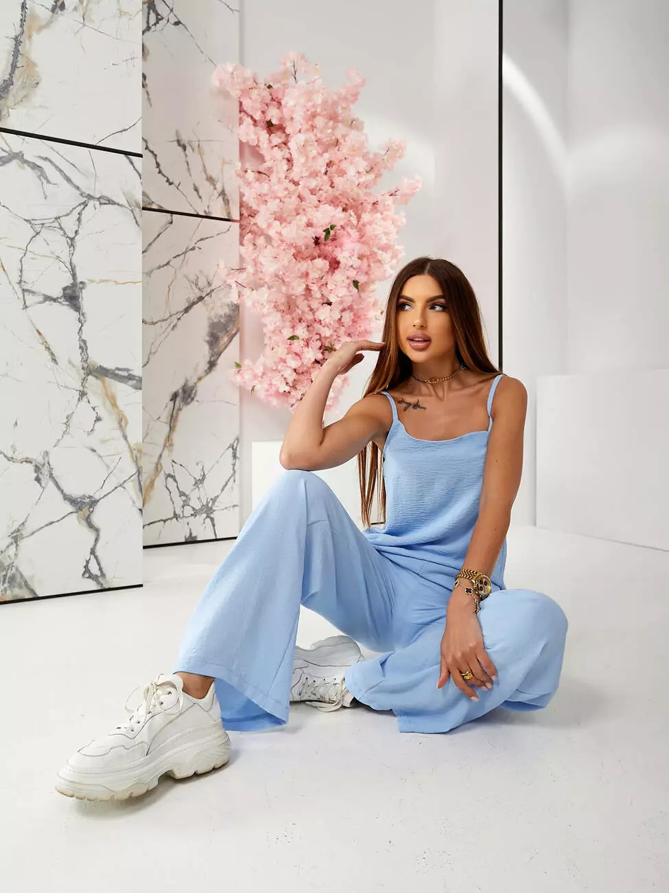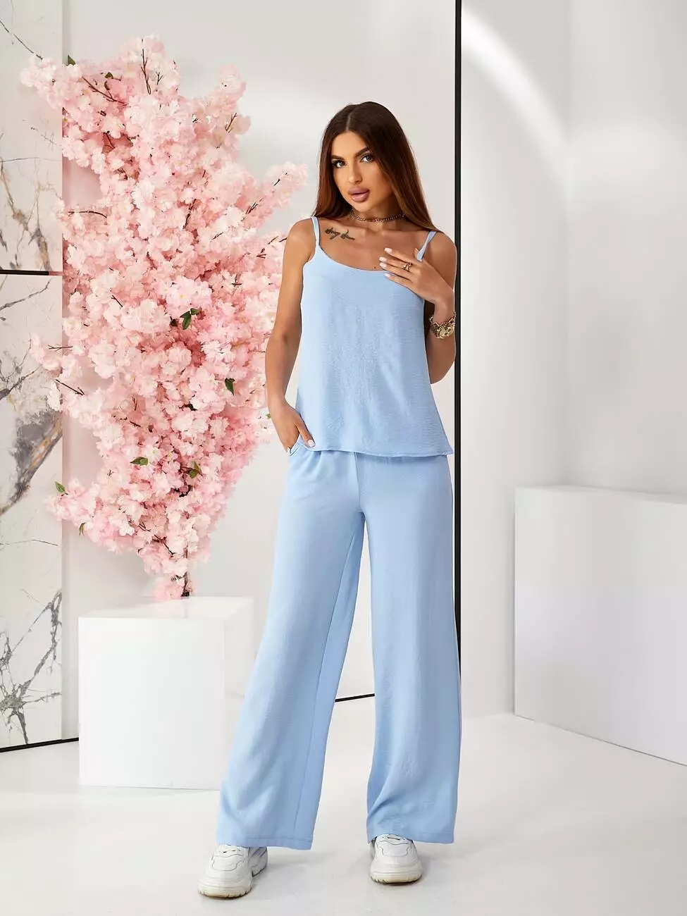 Брючний костюм з топом блакитного кольору