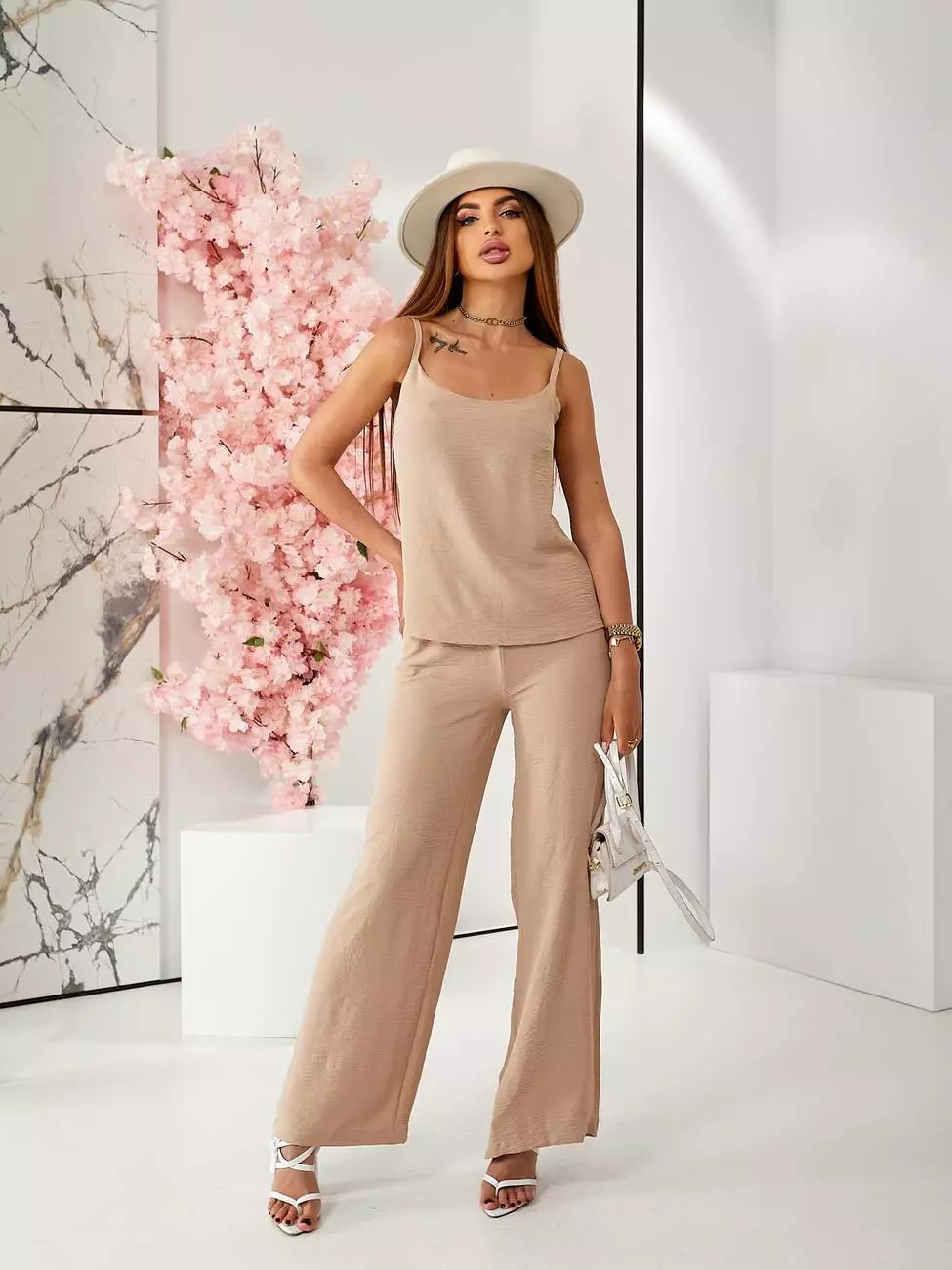 Брючний костюм з топом бежевого кольору