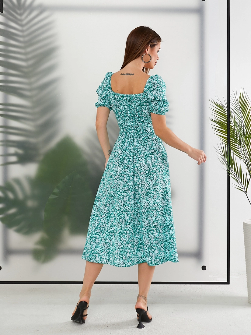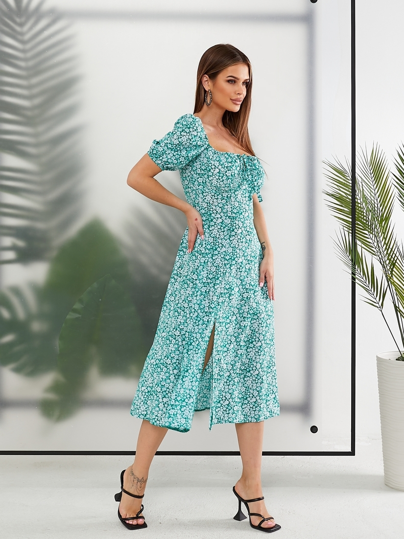 Сукня літня зеленого кольору з квітковим принтом та розрізом