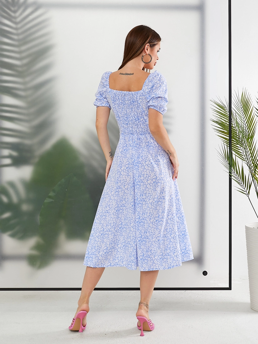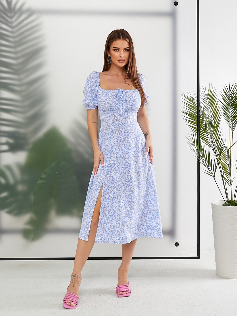 Сукня літня блакитного кольору з квітковим принтом та розрізом