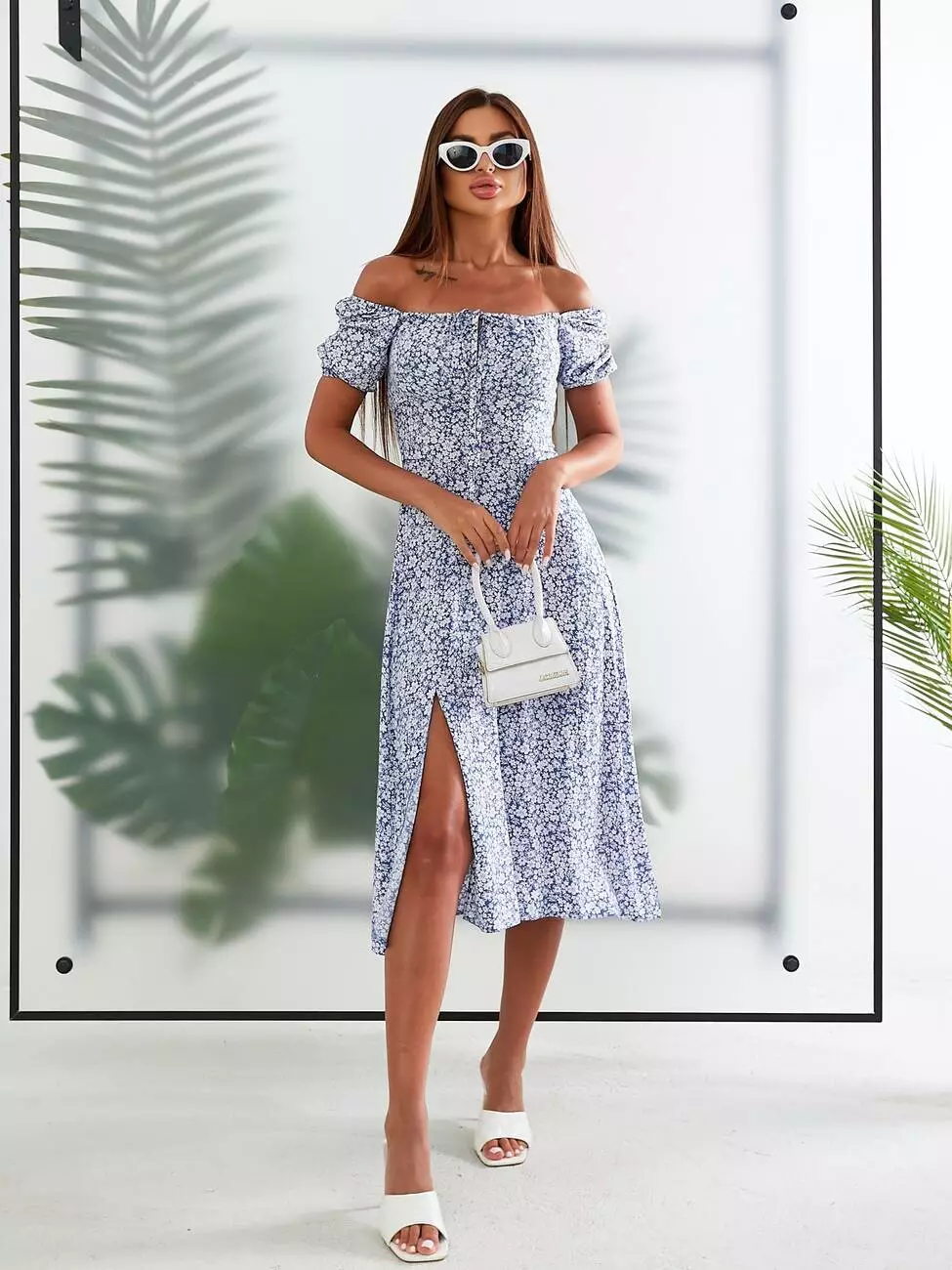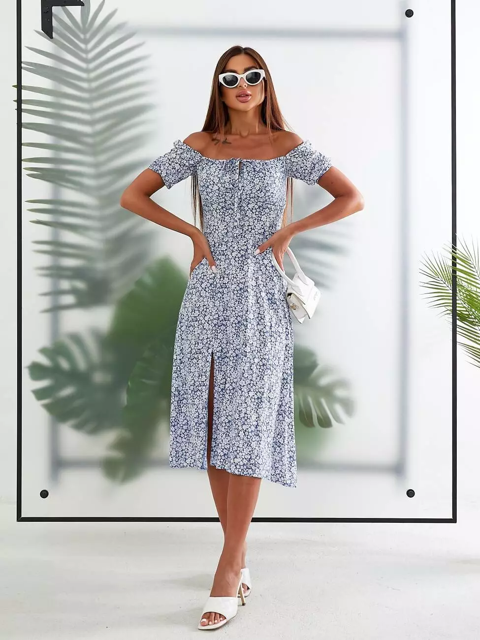 Сукня літня кольору джинс з квітковим принтом та розрізом
